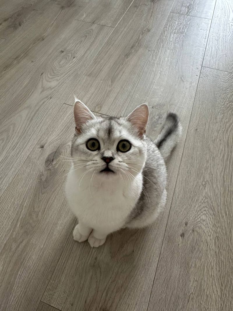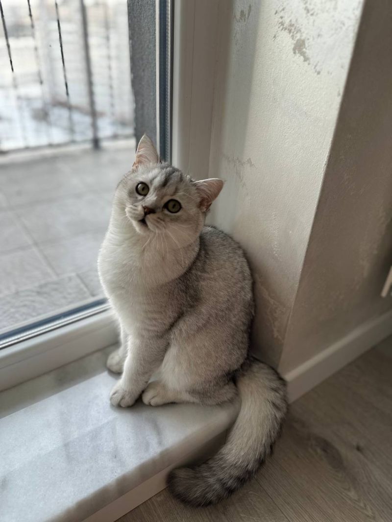 Грайлива кішка шукає дружню сімʼю. Порода: шотландська прямовуха короткошерста.
