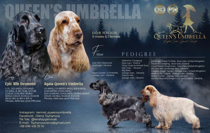 З радістю повідомляємо про народження цуценят від нашої легендарної пари — EPIC WIN DESMOND та AGATA QUEENS UMBRELLA! Ці малюки — плід любові та ідеального поєднання чемпіонських кровей. Кожне цуценя — це не просто собака, а майбутній член вашої родини з блискучим родоводом. На особливу увагу заслуговує їхнє дивовижне забарвлення — ніжний світлий блакитний роан. Такий окрас зустрічається рідко і надає цуценятам особливого шарму. Не втрачайте свій шанс стати власником цього маленького дива. Кількість цуценят обмежена! Забронюйте щастя вже сьогодні! Для отримання додаткової інформації та фото пишіть у Direct.